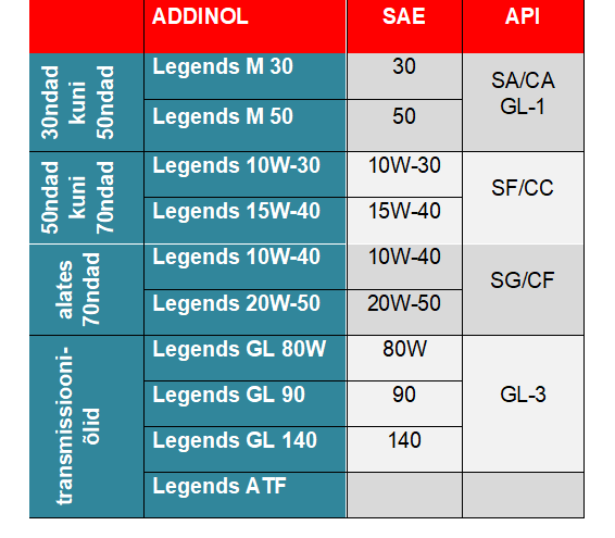 Paljude vanasõidukite manuaalidest võib leida erinevaid spetsifikatsioone, mis pole tänapäeval enam kasutusel. Sarnaselt õlidega on muutunud ka jõudlusnõuded ja institutsioonid, kes neid nõudeid sõnastasid. Kuni 1950. aastani väljendati näiteks mootoriõlide viskoossust Engleri kraadides. Tänapäeval on levinud mootoriõlide liigitamine viskoossuse järgi SAE klassidesse. Muutunud on ka mootori- ja transmissiooniõlide API klassid. ADDINOL Legends tootesari vastab täielikult toonastele jõudlusnõuetele.
