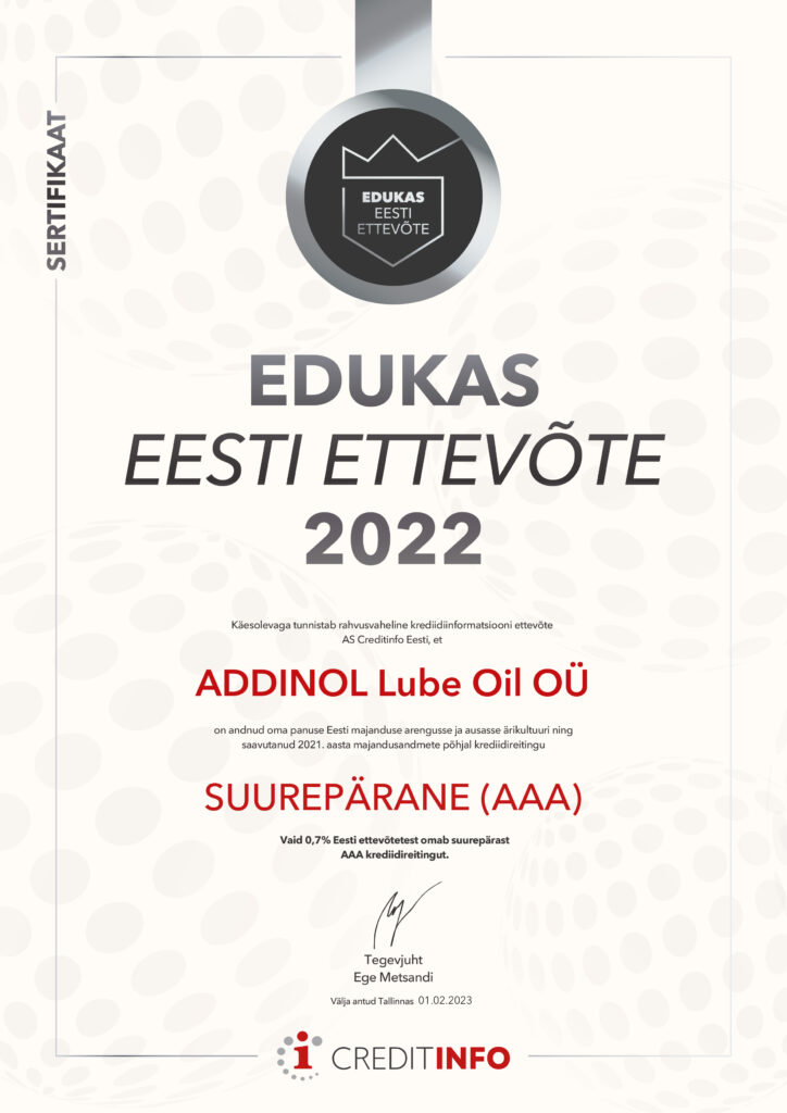 Rahvusvaheline krediidihindamise ettevõte Creditinfo tunnustab igal aastal edukaid Eesti ettevõtteid, kelle majanduslik seisukord on Creditinfo reitingu järgi suurepärane (AAA), väga hea (AA) või hea (A). Creditinfo hindas ka tänavu ADDINOL Lube Oil OÜ reitingu järjekordselt suurepäraseks (AAA), mis on kõrgeim hinnang. See on märk sellest, et oleme andnud oma panuse Eesti majanduse arengusse ja ausasse ärikultuuri. Vaid 0,7% Eesti ettevõtetest omab suurepärast AAA krediidireitingut. Kanname uhkusega „Edukas Eesti Ettevõte 2022“ tiitlit ja anname endast parima, et olla jätkuvalt usaldusväärne partner klientide, töötajate ja koostööpartnerite silmis.