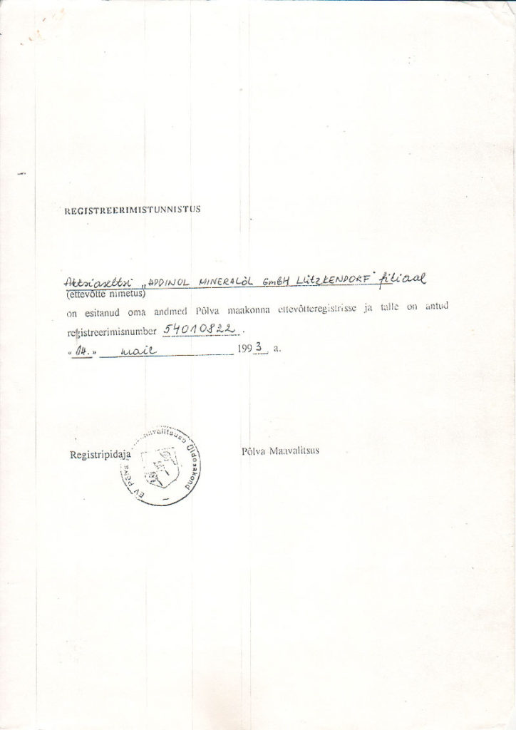 Filiaali ümberregistreerimine osaühinguks - Addinol Mineralöl Marketing OÜ.