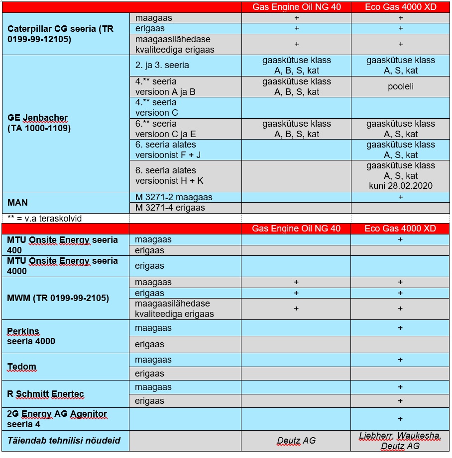 Eco Gas 4000 XD näol on tegemist ajakohase gaasimootoriõliga maagaasi ja puhastatud biogaasi jõul töötavatele mootoritele. Tänu uudsele manusekomplektile saame garanteerida Eco Gas 4000 XD hea saadavuse turul ning soovitame selle jõudluse ja tuntud mootoritootjate arvukate heakskiitude tõttu vahetada NG 40 gaasimootoriõli Eco Gas 4000 XD vastu.