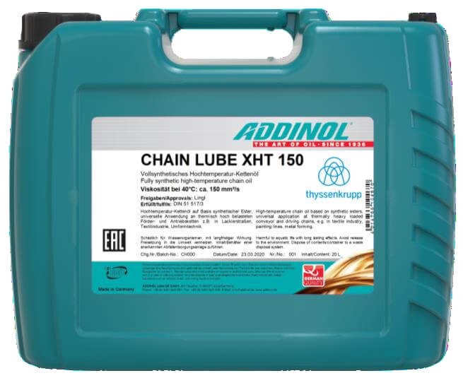 Kõrgtemperatuuriline ketiõli ADDINOL Chain Lube XHT 150 on üks kahest sünteetilisest määrdeainest, mis on välja toodud thyssenkrupp Elevator AG ketiõli üldspetsifikatsioonides.