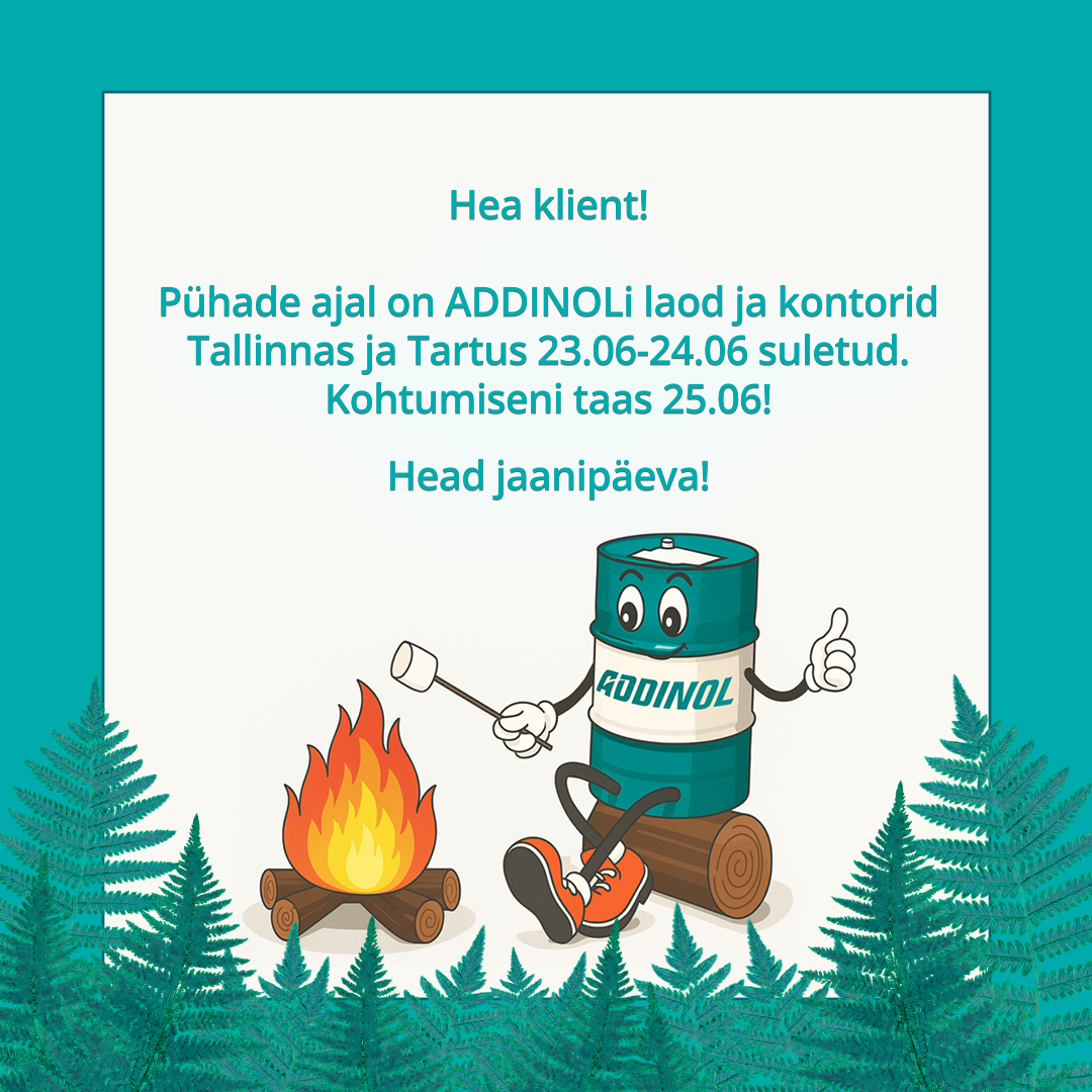 Lahtiolekuajad pühadel Inna Sevtsenko2025-06-20T15:25:32+03:0020.06.2025| Hea klient! Pühade ajal on ADDINOLi laod ja kontorid Tallinnas ja Tartus 23.06-24.06 suletud. Meie e-pood on aga avatud ööpäevaringselt, nii et saad ostud teha just endale sobival ajal! Head jaanipäeva!
