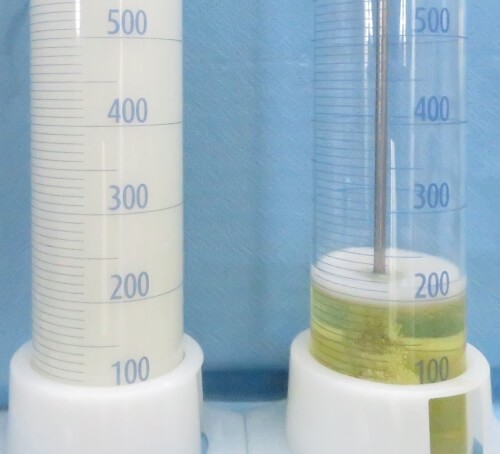 Vahu teke õlis – vasakul kergesti vahustuv õli, paremal vähese vahustumiskalduvusega õli