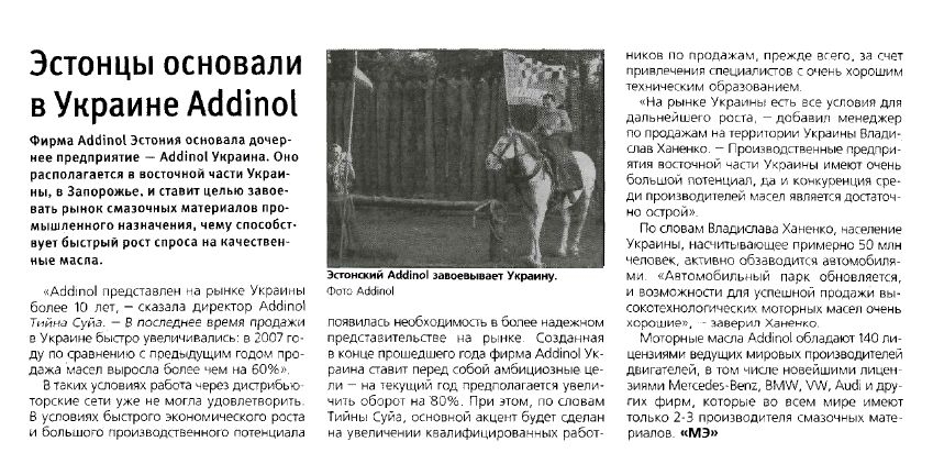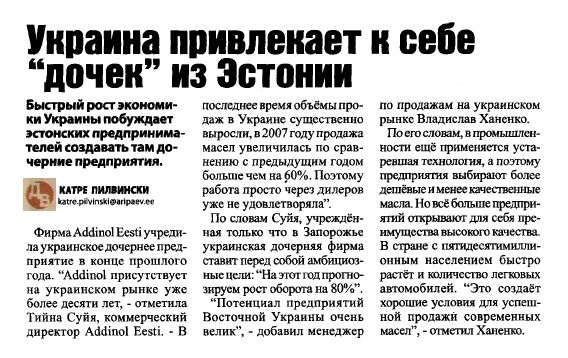 Эстонцы основали в Украине дочернее предприятие ADDINOL