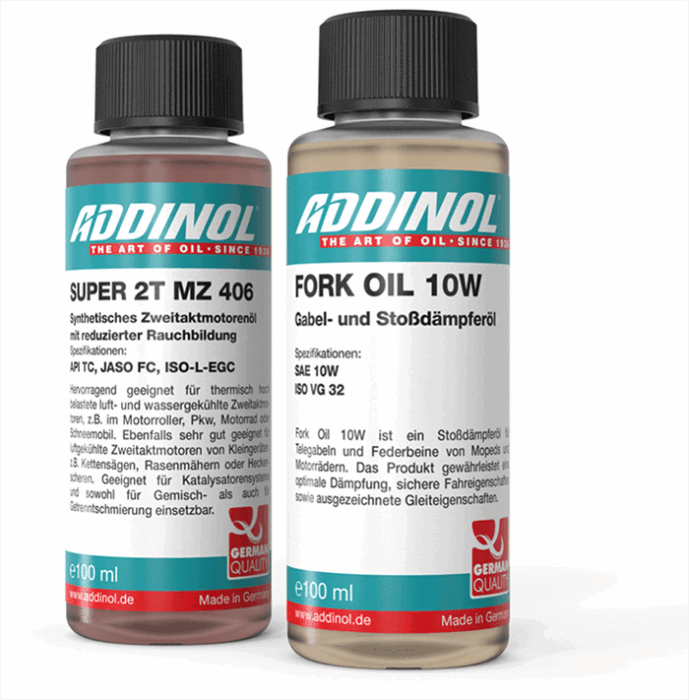 Iseäranis kahetaktilise mootoriga masinate ja kaherattaliste sõidukite jaoks on praktiline haarata kaasa käepärases pakendis õli. Seetõttu on järgmised tooted saadaval nüüdsest 100 ml pudelis: vana hea kahetaktiliste mootorite õli ADDINOL Super 2T MZ 406 ja uus teleskoop-esiharkidele mõeldud õli ADDINOL Fork Oil 10W.